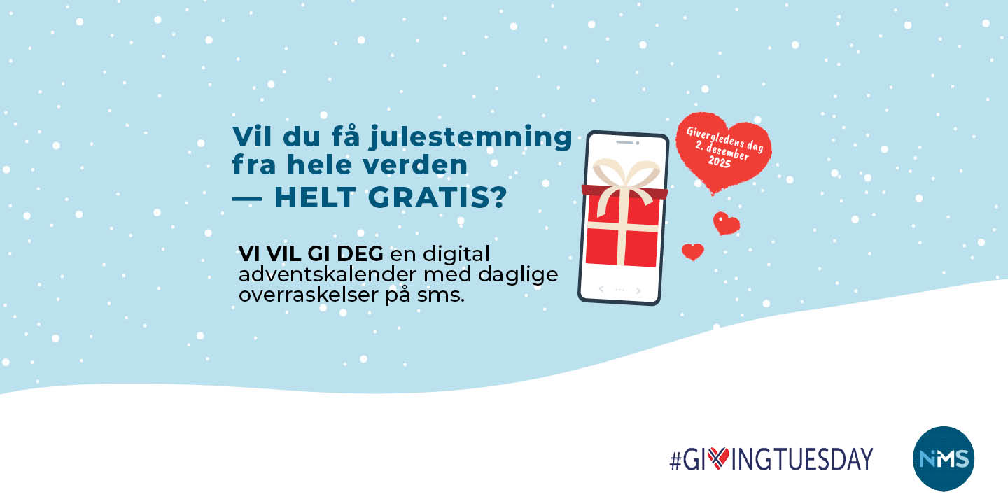 NMS vil gi deg en gave i anledning GIVING TUESDAY: En digital adventskalender med julestemning fra hele verden, tilsendt som daglige SMS. Meld deg på ved å sende kodeordet GIVING til 2002 eller bruk skjemaet under: