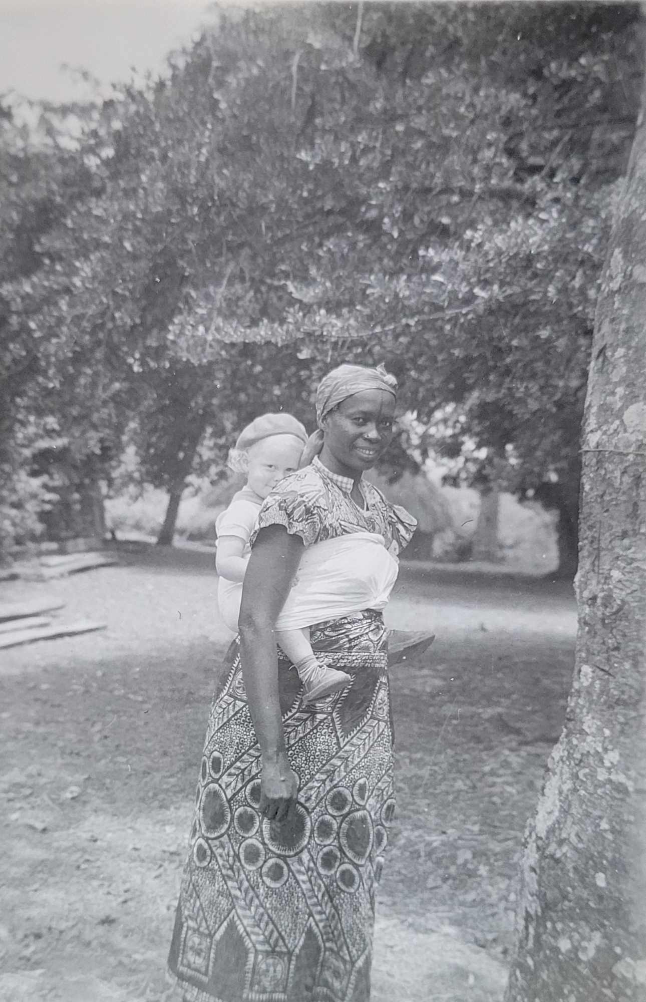 KALL: Olav og Gudrun Nicolaisen var misjonærer i Kamerun fra 1951-1960. De fikk tre barn mens de var der, Åse, Svein og Bjørg Hilde. Åse vokste opp på barnepasser Gadji (bildet t.v.) sin rygg og snakket ikke norsk før de flyttet til Norge. Foto: PrivatHun ser for seg barndomshjemmet i Galim, en landsby vest i Kamerun, cirka 30 mil fra byen Ngaoundéré. Her bor Mbum-folket, de fleste muslimer. Lamidoen er høvding og åndelig leder. I et lite hvitt murhus blir Åse født i 1953.− Jeg husker utsikten mot fjellene i Nigeria. I hagen var det sitroner, mango, appelsiner og bananer. En kameleon skifta farge når den satte seg på klærne, mimrer Åse.Hun stryker hånda over den gamle dagboka. Det er som om hun ser fargene for seg, hører lydene og kjenner lukta av Gadji som bar henne på ryggen hver dag.