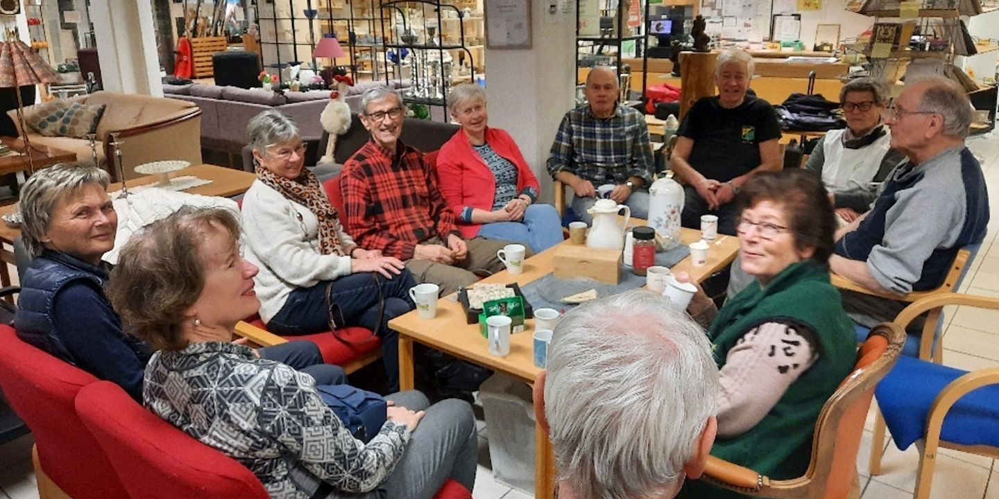 Klokken 19.00 er det kaffe. Noen har med seg matpakke – rett som det er dukker det opp en kringle eller en kake eller noen kanelboller. Praten går livlig, og latteren sitter løst. Så er det tid for «Ord for dagen». En liten andakt før det igjen er full fart for å gjøre unna resten av det som skal ryddes og prises.