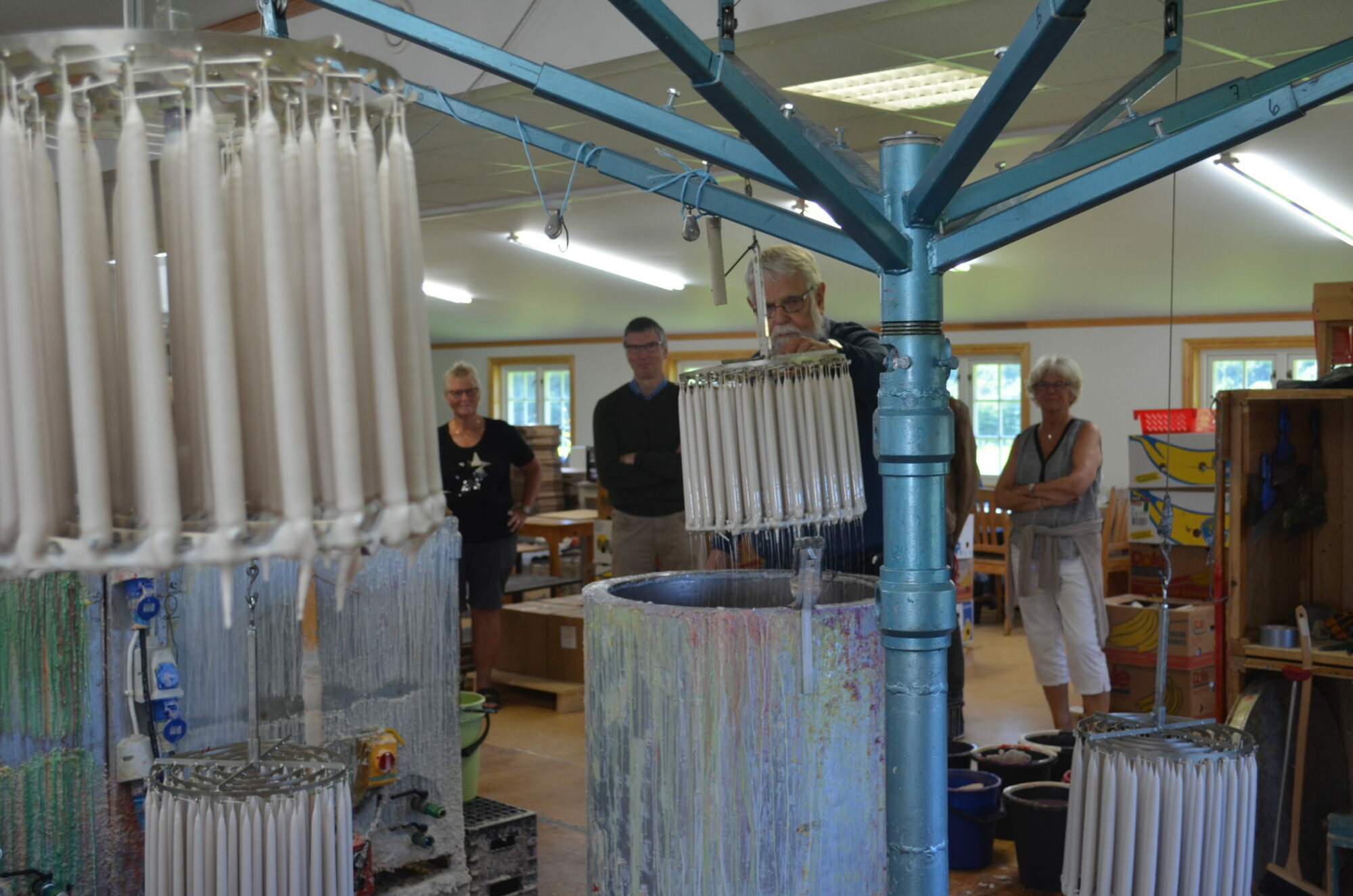 Gert Nilsen viser fram hvordan masseproduksjon av lys kan fungere. Gert deler på den daglig leder rollen i Knausen med Marvin Bjørnebekk. Gert tok seg av omvisninga på lysstøperiet på Jaktøyen Nordre.[/caption]I forbindelse med at Knausen lysstøperi har 20-årsjubileum i år, var det omvisning for de som ville på lysstøperiet, og etterpå var det fest i Melhus bedehus. Det var nåværende frivillige, tidligere frivillige, ansatte ved gjenbruksbutikker og ansatte i NMS. Kåre Myraunet ledet samlinga. Kåre er sekretær og markedsansvarlig for Knausen. Det var fortellinger fra historien fra virksomheten, det var musikk, allsang og god mat og kaker. Og trivelig prat rundt bordene. Til middagen ble det servert gulasj laga på Mjuklia og frakta til Melhus. Under bespisninga rullet det bilder med tekst på en stor skjerm. Bildene var fra virket ved lysstøperiet gjennom 20 år.[caption id="attachment_60586" align="alignnone" width="349"]